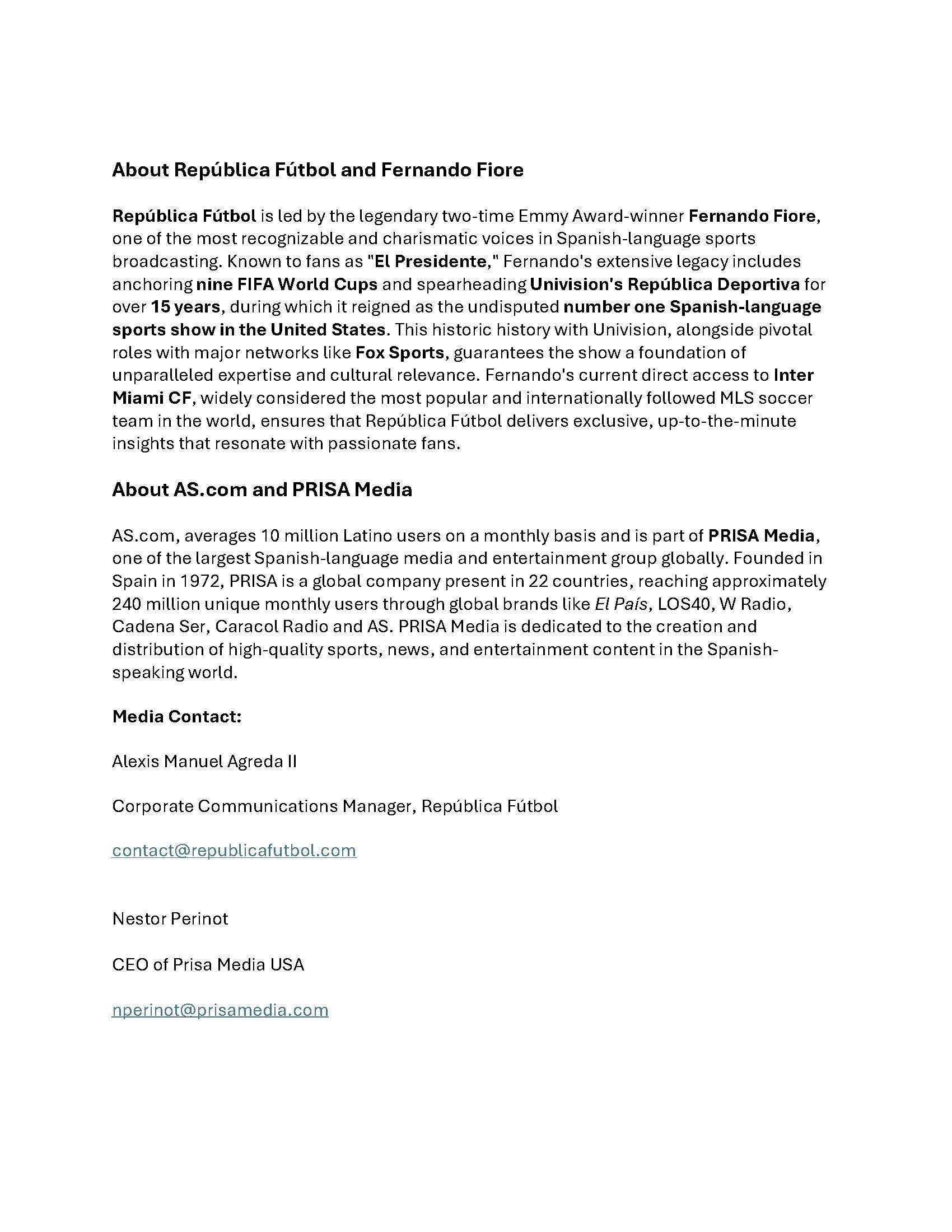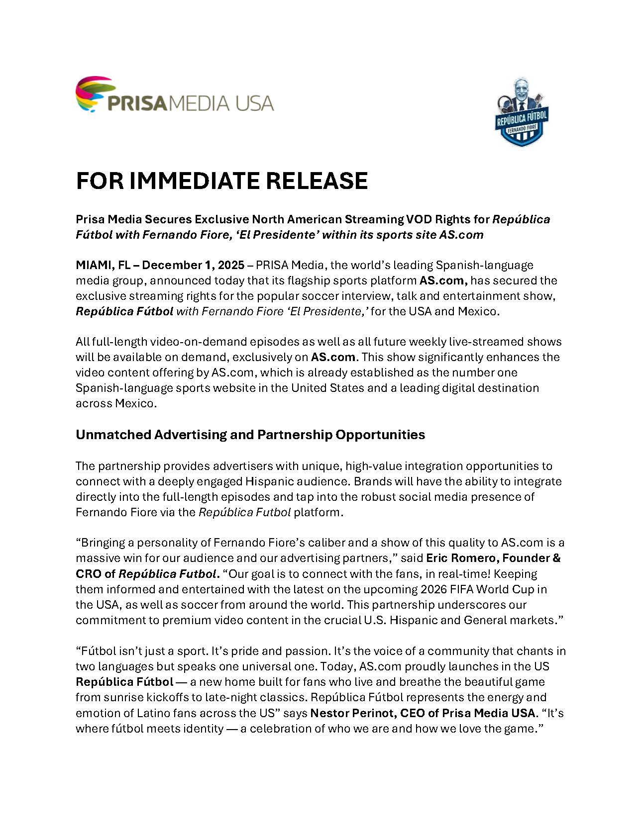 Prisa Media Secures Exclusive North American Streaming VOD Rights for República Fútbol with Fernando Fiore, ‘El Presidente’ within its sports site AS.com